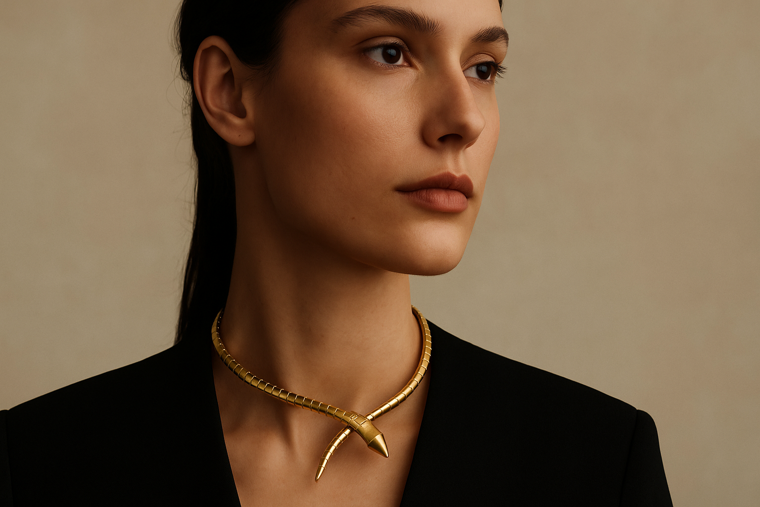 Atelier Metals launches with its hero piece, the Linear Serpent Torque. Positioned as modern armor for living, it blends architectural strength with quiet elegance.