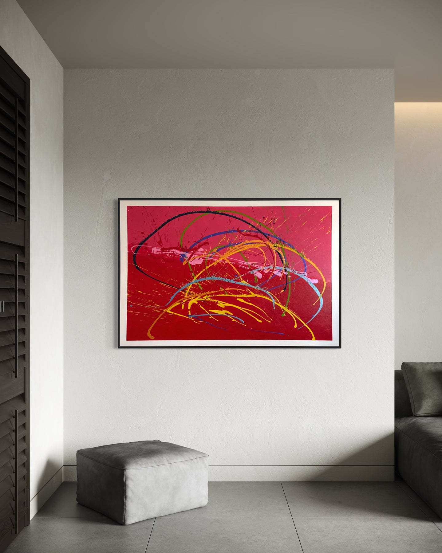 Notes: A contemplative work of layered reds, oranges, and earthen textures, this piece evokes the warmth and unpredictability of firelight. Originally titled Dragons Love Tacos for its playful palette, it now carries dual readings — humor and poetry entwined.